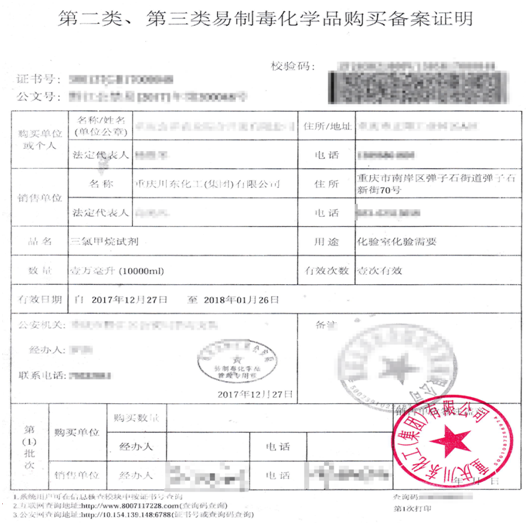 1.經(jīng)辦人身份證正反復(fù)印件、手機號碼、固定電話、公司所在地公安局派出所名稱; 2.企業(yè)營業(yè)執(zhí)照、銷售合同回傳件; 3.合法使用證明模板及《易制爆危險化學(xué)品購買告知書》,(銷售單位提供模板,購買單位蓋章回傳); 4.危化品經(jīng)營許可證(僅經(jīng)銷商需提供,且購買的產(chǎn)品必須在許可證名錄范圍內(nèi));